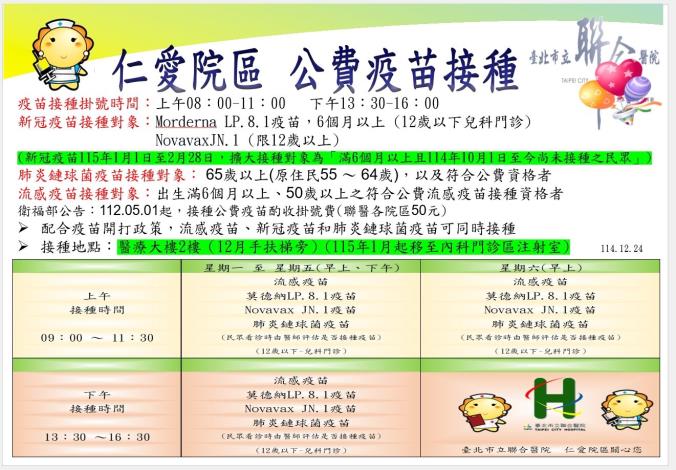 疫苗接種掛號時間:上午08:00-11:00 下午13:30-16:00新冠疫苗接種對象:Morderna LP.8.1疫苗,6個月以上 (12歲以下兒科門診) N ...更多