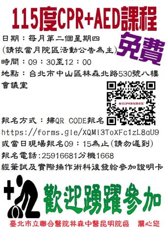 115年度CPR+AED課程,歡迎踴躍參加!日期:每月第二個星期四(請依當月院區活動公告為主)時間:09:30至12:00地點:臺北市中山區林森北路530號8樓會議室報名電話:(02)2591-6681分機1668