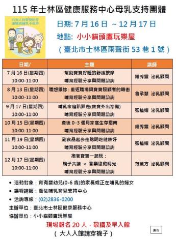「115年上半年母乳哺育系列課程」活動訊息本中心為增進媽媽們母乳哺餵知識及概念,以提升母乳的哺餵意願,並建立完善支持性環境,辦理相關課程訊息如下:時間:115年7月16日至115年12月17日,共辦理6堂課程。地點:小小貓頭鷹玩樂屋(士林區雨聲街53巷1號)。對象:育有嬰幼兒(0-6歲)的家長或正在哺乳的婦女。費用:課程免費,大人入館請穿襪子。報名方式:採現場報名,名額20人,額滿為止,請提早到場 ...更多