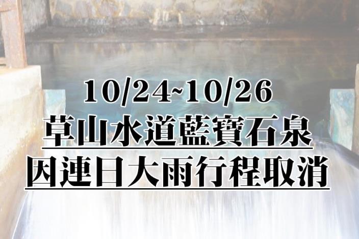 因陽明山地區連日大雨,為確保行程安全,114/10/24(五)~10/26(日)草山水道藍寶石泉行程取消。本處將辦理全額退款,相關退款方式已寄送至報名者信箱,請留意信件內容。如有任何疑問,歡迎來電洽詢:02-8369-5104。感謝您的理解與配合,請留意自身安全。