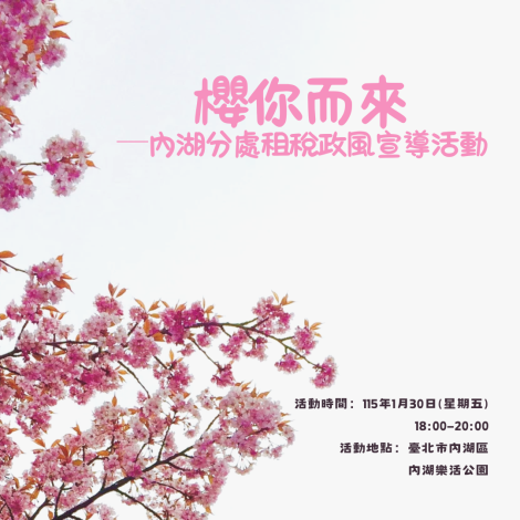 活動宣導資訊⇲ 活動時間:115年1月30日(星期五)18:00至20:00⇲ 活動地點:內湖區內湖樂活公園⇲ 活動方式:1. 闖關兌換:完成「租稅 Q&A 問答」及「雲端發票四部曲」任選2部曲,即可兌換宣導品 1 份(數量有限,送完為止)。2. 捐贈雨端發票兌換宣導品:捐贈115年1月之雲端發票5張以上(須符合:未登打統一編號、消費金 ...更多