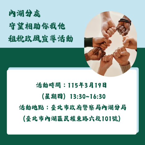活動宣導資訊⇲ 活動時間:115年3月19日(星期四)13:30至16:30⇲ 活動地點:警察局內湖分局(內湖區民權東路6段101號)⇲ 活動方式:1. 闖關兌換:完成「租稅Q&A問答」及「雲端發票四部曲」任選2部曲,即可兌換宣導品 1 份(數量有限,送完為止)。2. 捐贈雲端發票兌換宣導品:捐贈115年1、2月之雲端發票5張以上(須符 ...更多
